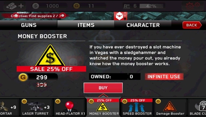 商店里出售主副武器,功能性物品,以及回血的绷带等。分为游戏币和金币两种购买方式。随着等级的提升,会解锁更高级的枪支以及装备物品。新手屌丝们只有一把枪,还是要快快升级速速赚钱买枪才是变身高富帅完虐僵尸的唯一途径啊!(咳咳,当然嘛,真正的高富帅还是直接使用金币购买哒~我等屌丝望尘莫及的说…)