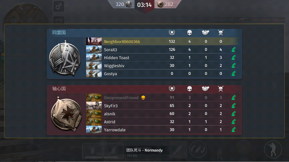 游戏会显示同盟国与轴心国的战绩,诺曼底团队死斗模式特别注重团队协作和个人击杀效率,合理的团队配合和精确的击杀将直接影响战局的胜负。