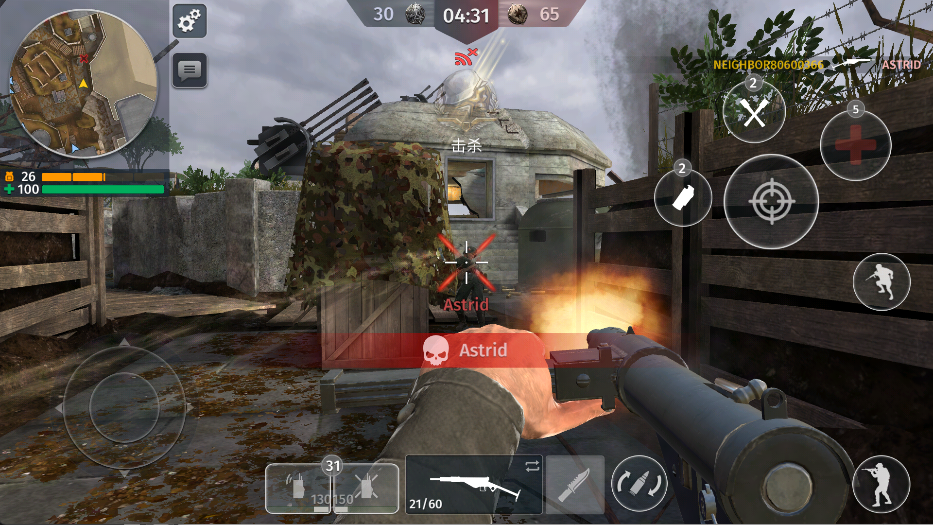 在战斗中遇到敌人时,使用冲锋枪进行击杀,体验战场还原的二战诺曼底场景。同时,战斗界面会实时显示击杀和血量信息,帮助你时刻掌控战斗进程。